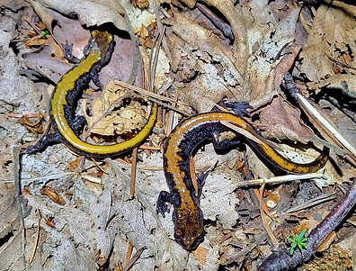 Two Coeur d'Alene salamanders in leaf litter. [Photo: Amber Peters]