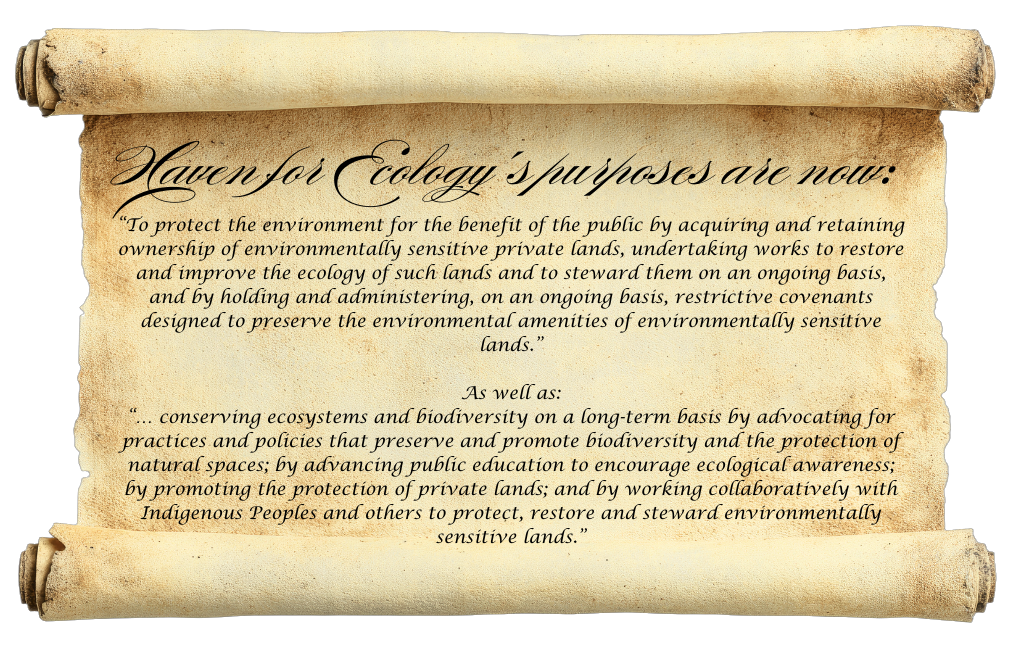 “Without going into the weeds on the many complexities of changing everything (designation, purposes and name) with the CRA and with the provincial authorities (the Societies Branch), suffice it to say it required a lot of administrative work,” said Lorna Visser, Haven for Ecology’s Executive Director.